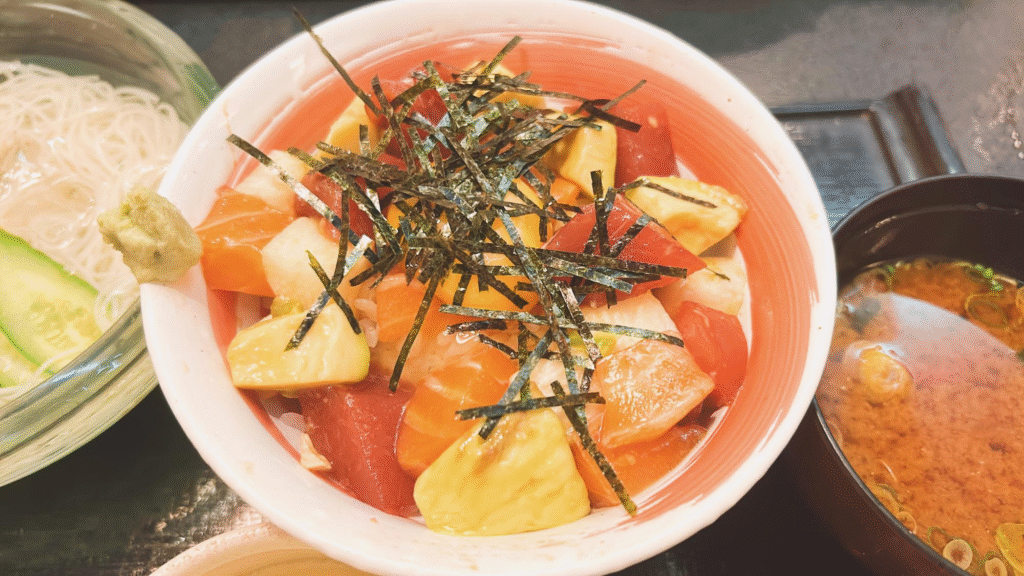 丼には大きめに切られたマグロやサーモンと、濃厚なアボカドや長芋が入っており、卵黄と絡めながら食べると最高においしかったですよ。