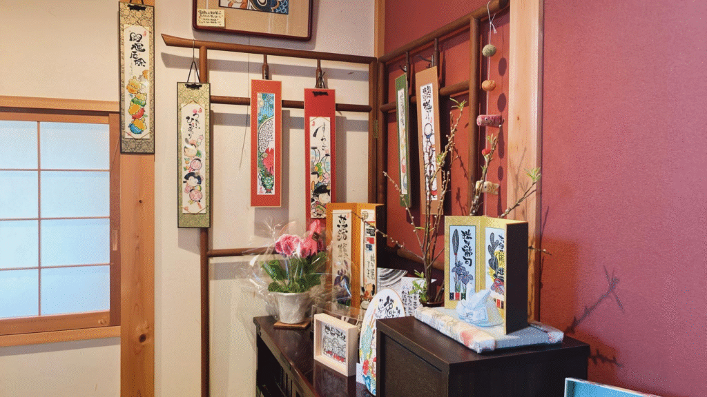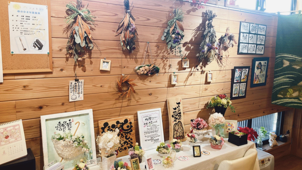 壁面にはたくさんのフラワーアレンジメントと、素敵な絵とユニークな字体が特徴の己書アートが飾られていて、見ているだけでもとても楽しかったです。