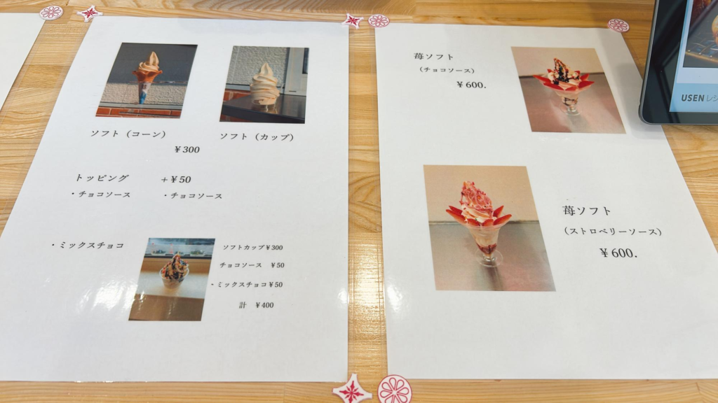 また、ソフトクリームやパフェもあり、外ではありますが机や椅子も用意されています。
