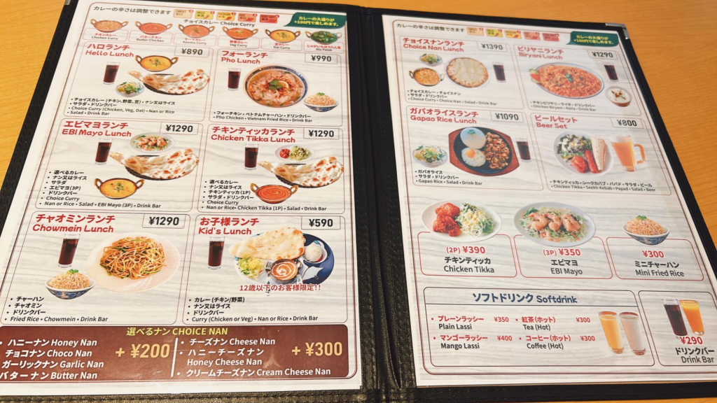 また、カレー以外にもベトナム料理のフォーや、ネパール料理のチャオミンなどさまざまなアジア料理を楽しむことができますよ。