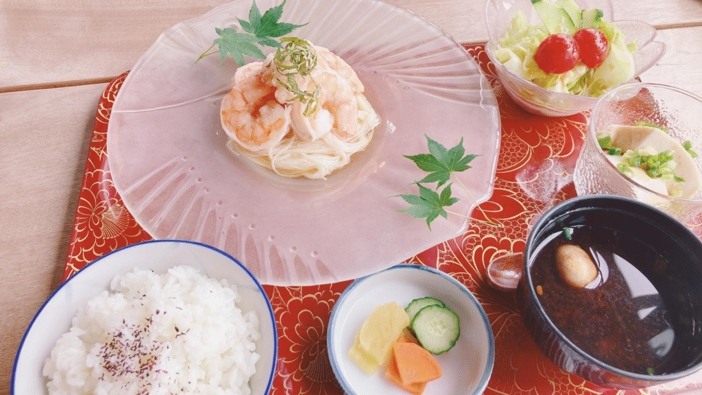 夏のお任せ御膳のこの日のメインは海老がのったそうめんでした。