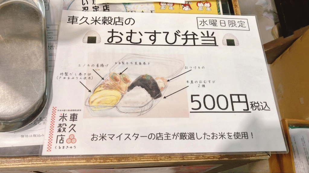 そんな車久では水曜日限定でおむすび弁当の販売を行っていることをご存知でしょうか。