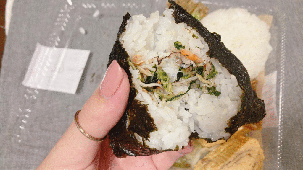 海苔にまかれたおむすびは中にちりめんじゃこの入ったふりかけが入っていました。