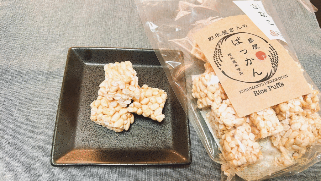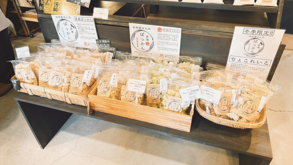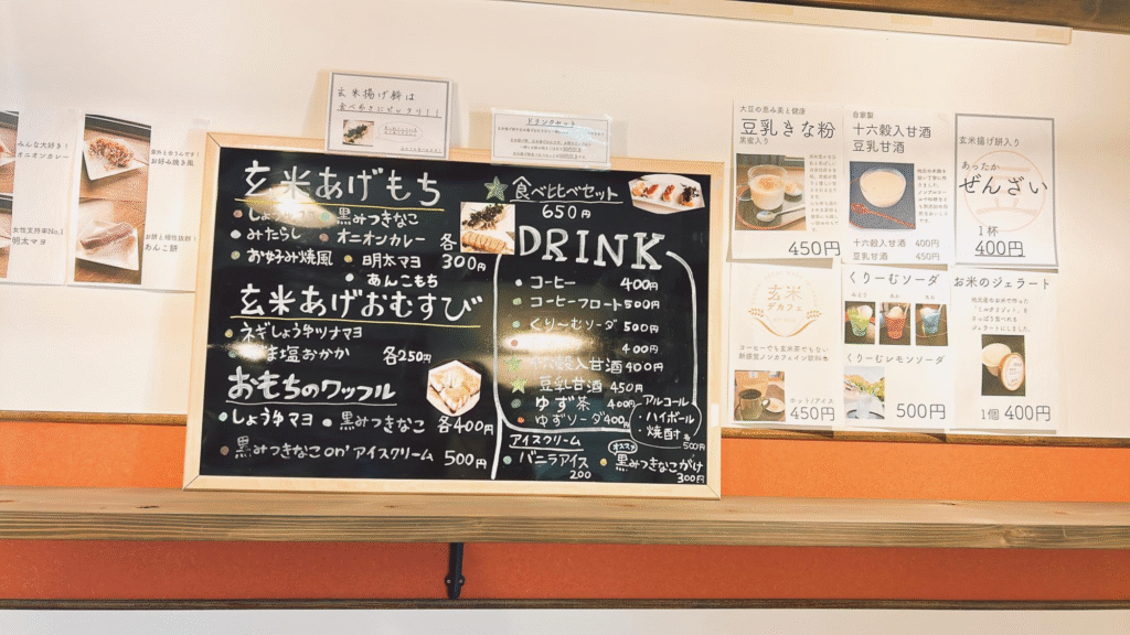 玄米あげもちや玄米あげおむすびなど、お米やきな粉を使った和スイーツが豊富で、イートインだけでなく食べ歩きもできますよ。