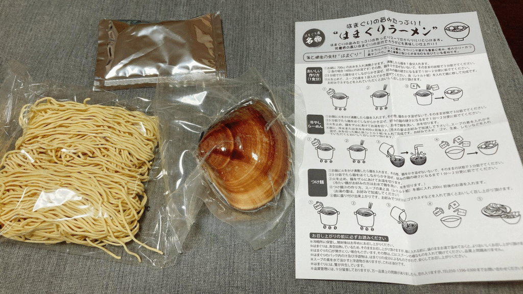 箱の中身は乾麺とスープ、ハマグリ1個、作り方の紙です。