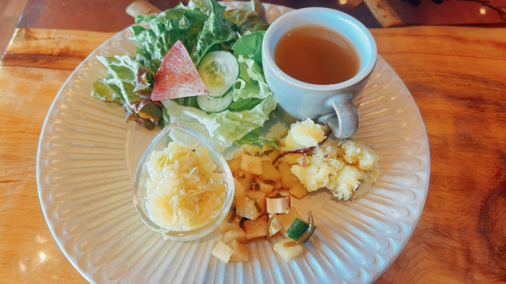 たっぷりの野菜と優しい味わいのスープ、デリがついていていろいろな物を食べられるのが嬉しいです。