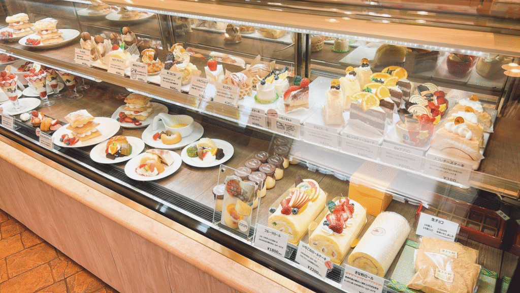 店内に入るとすぐに大きなショーケースがあり、たくさんのケーキが並んでいます。
