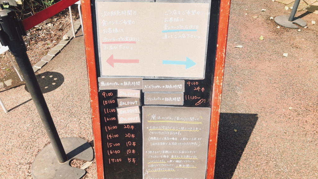 入口には焼き上がりの時間と本数が書かれており、焼きあがり時間前には行列ができていることが多い大人気商品で、専用の待ちレーンがあります。