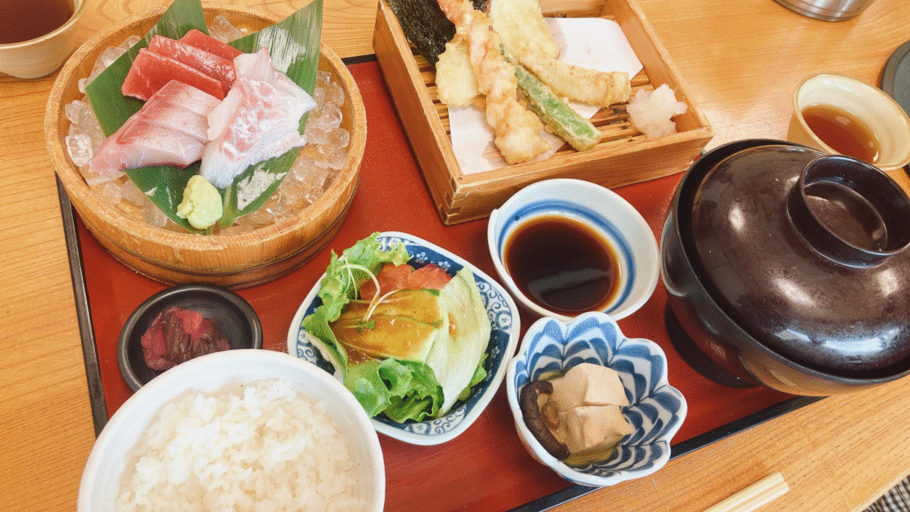 肉厚のお刺身がとてもおいしく、天ぷらやサラダなどがついて見た目にも豪華!