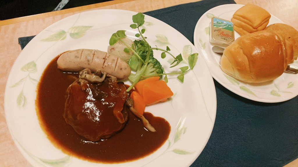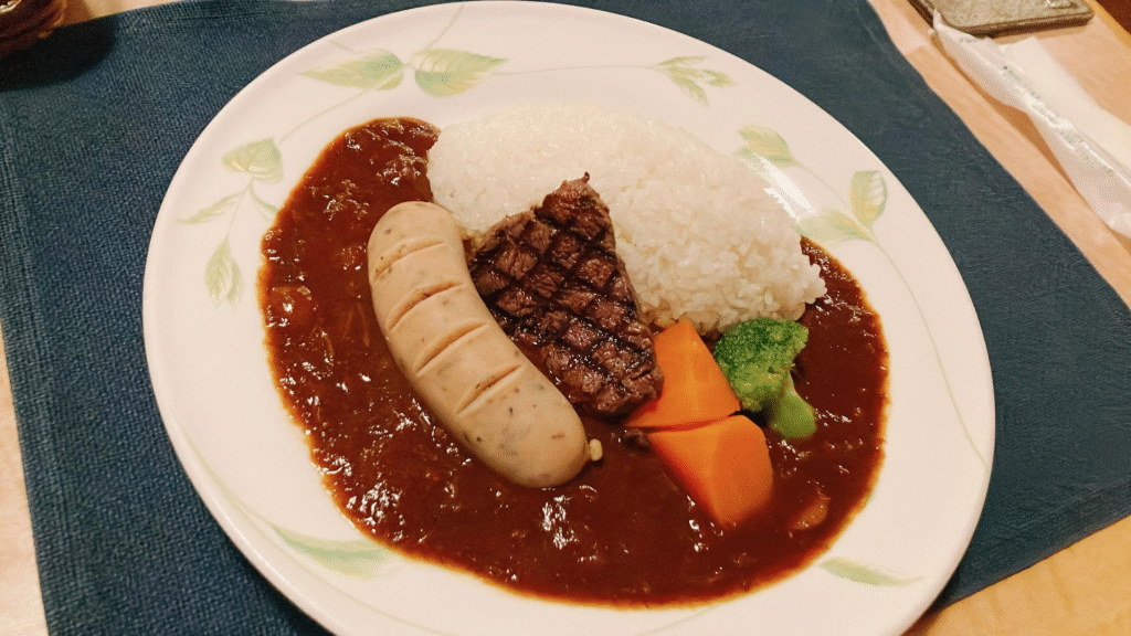ハヤシライスだけでなくステーキやソーセージまで食べられる欲張りメニューです。