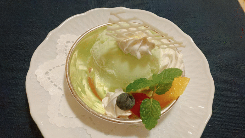 この日のシャーベットはメロン味で、爽やかな味でおいしかったです。