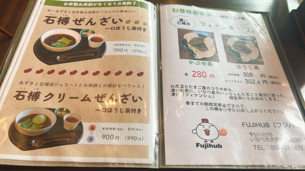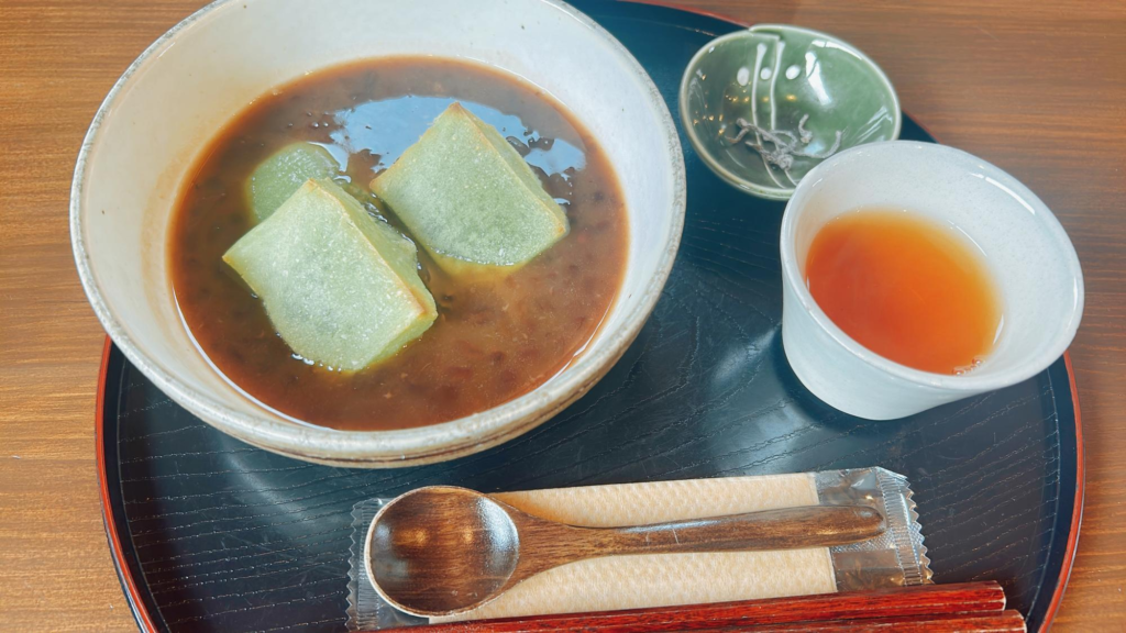 石榑茶が練りこまれたお餅が楽しめる逸品で、やや塩気を感じるぜんざいはあっさりとしていて最後までおいしく食べられます。