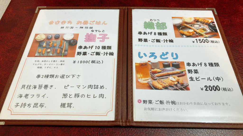 串揚げ8種類付の『織部』、+2種類選べる『撫子』、そしてビールを楽しみたい方向けの『いろどり』の3種類あり、ごはん、みそ汁、野菜はおかわり自由となっています。