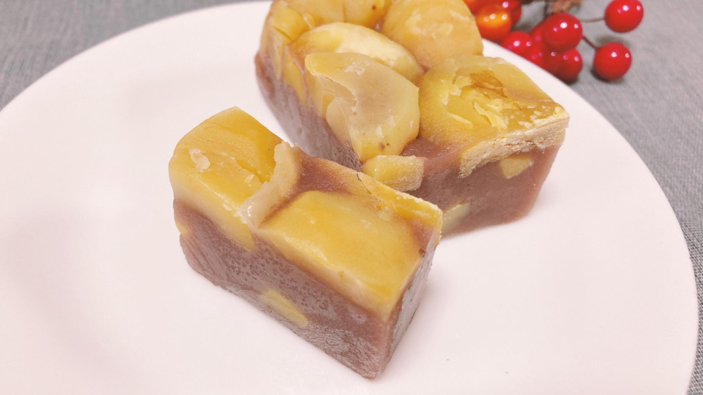 栗がゴロゴロとのった栗むし羊かんは個人的に大好きな逸品です。
