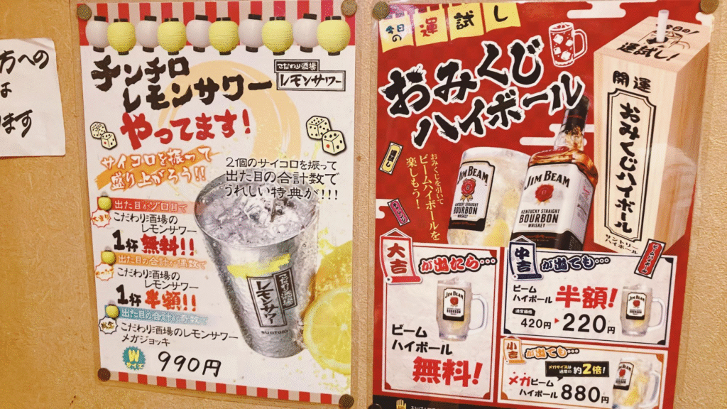 運試しで無料~安くお酒が楽しめるメニューもあり、夜に訪れると楽しそうなお店だと思いました。