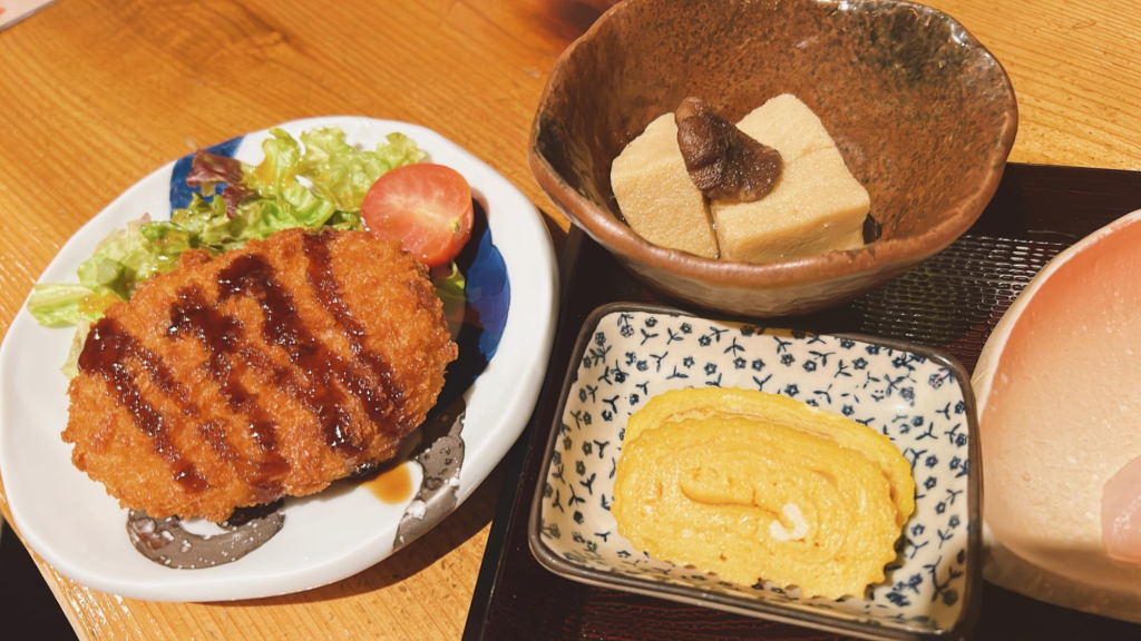 お盆にのった定食だけでなく、コロッケが後から出てきて驚きました。