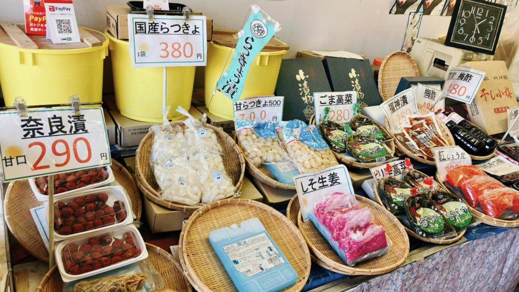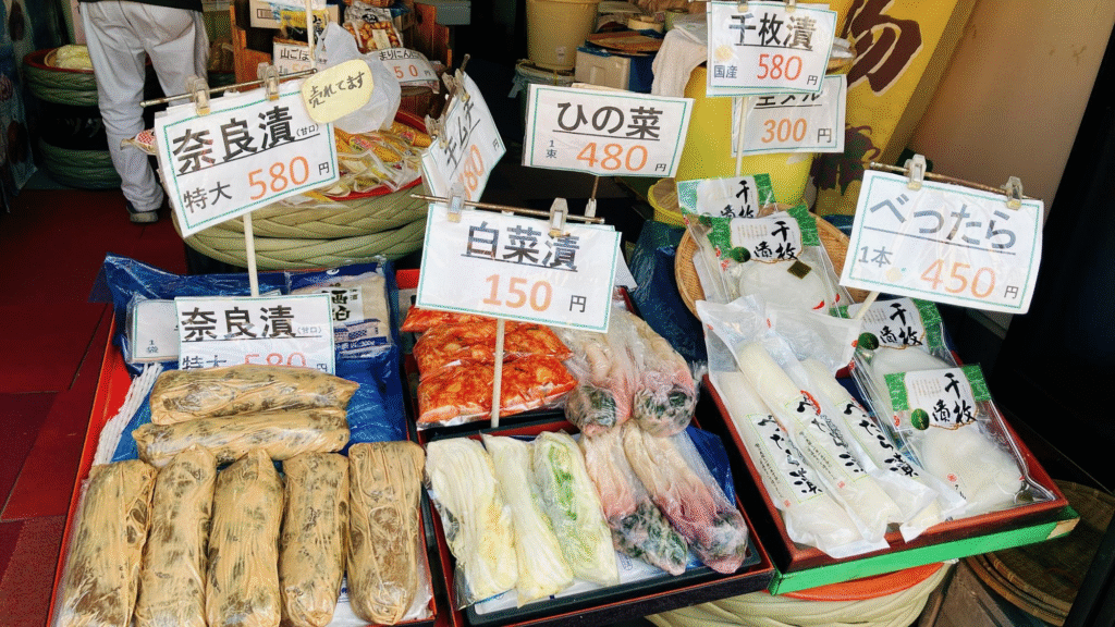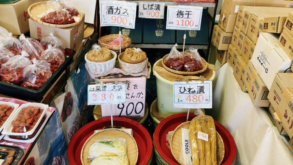 商店街の南側出口から見えるお漬物の旗に惹かれて近づいてみると、店内にはお漬物がずらり!