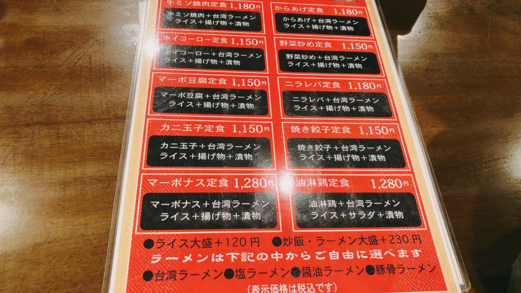 定食メニューは台湾ラーメンのほか、しょうゆ、塩、豚骨ラーメンに変更することも可能です。