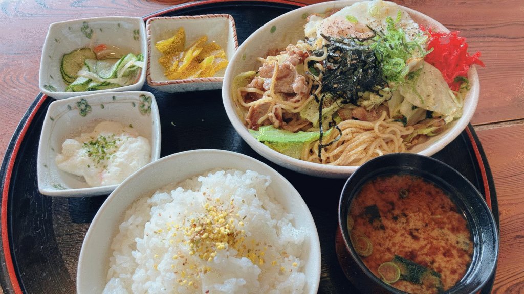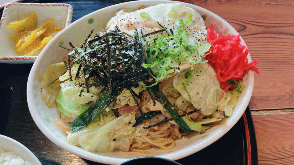 シャキシャキのキャベツの甘みと程よい塩気の焼きそばがおいしく、おなかいっぱいと思いつつなぜか白米も進んでしまいます。