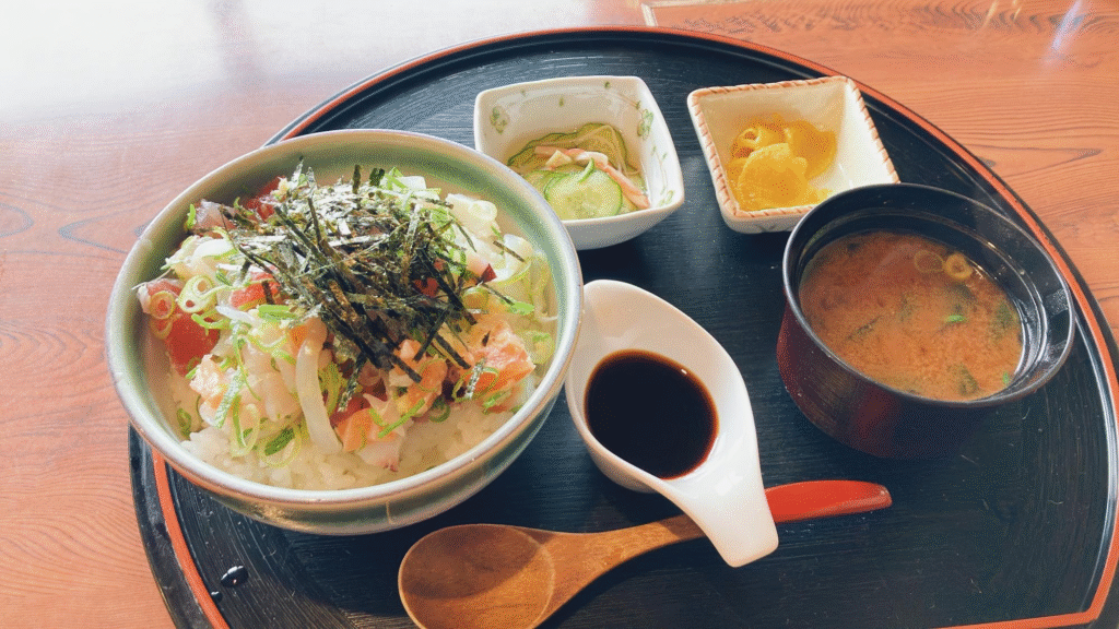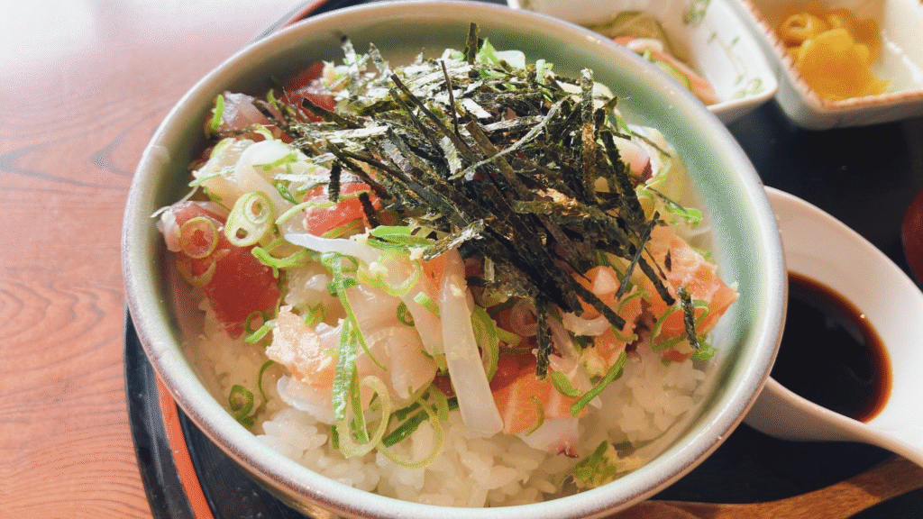 ホカホカご飯の上にはマグロ、サーモン、イカなどのたっぷりの海鮮がのっています。