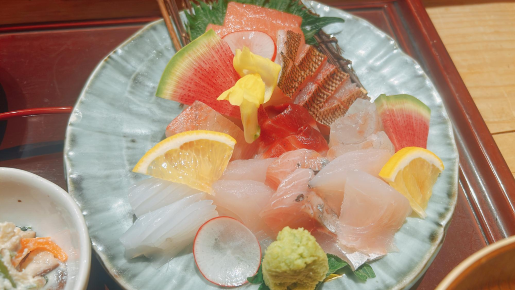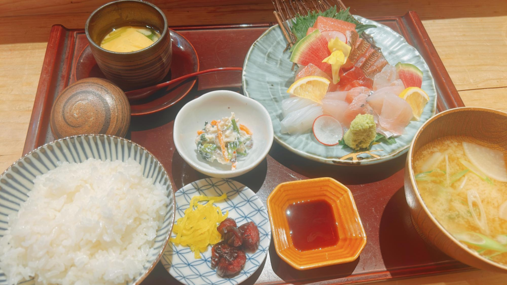 メインのお刺身に加えて、お味噌汁や小鉢、茶碗蒸しが付いて豪華ですね。