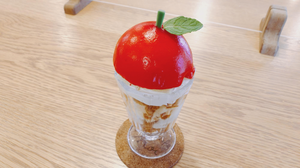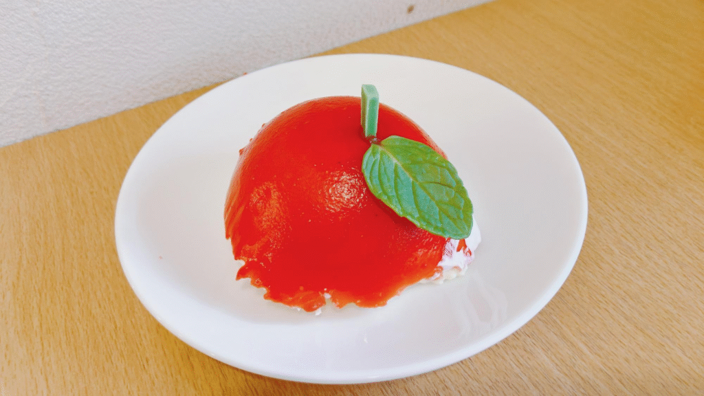 赤い部分はりんごのムースになっていて、口当たりなめらかで優しい甘みを感じます。