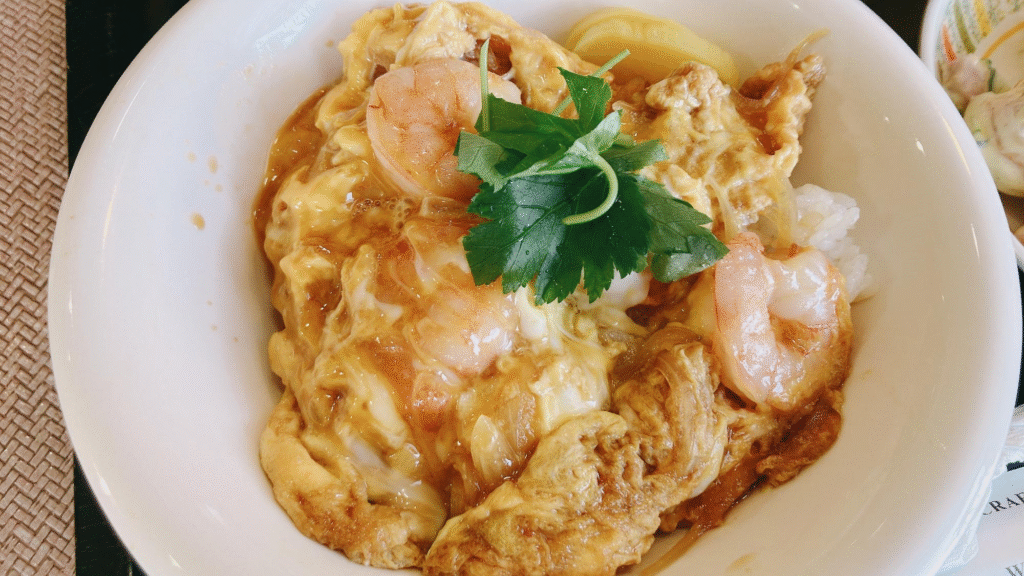 プリプリの大きなエビがゴロゴロ、トロトロの玉子たっぷりとかかっていておいしいです。
