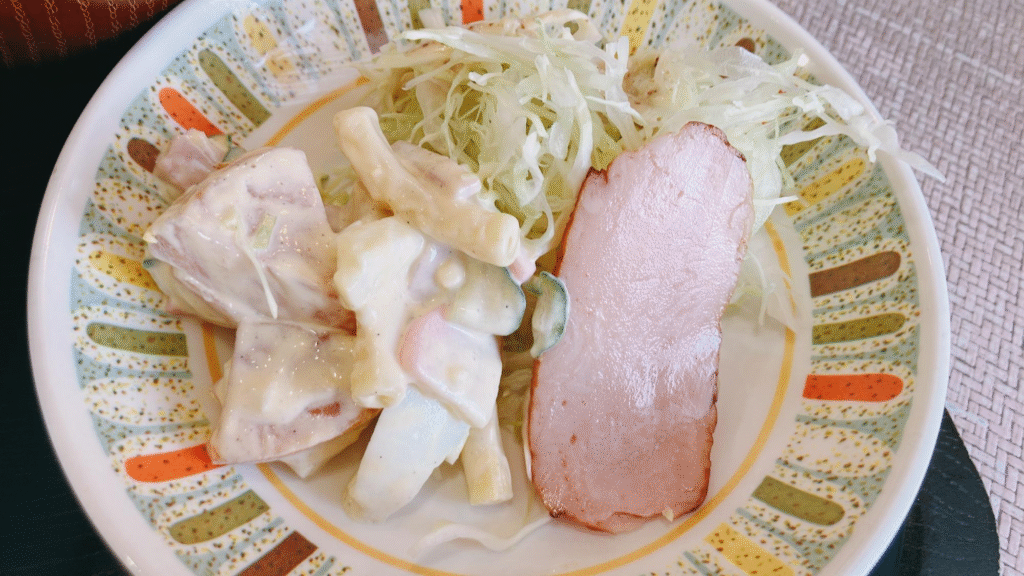 マカロニサラダには柿が入っていたり、焼豚がのっていたりとサラダも豪華ですね。