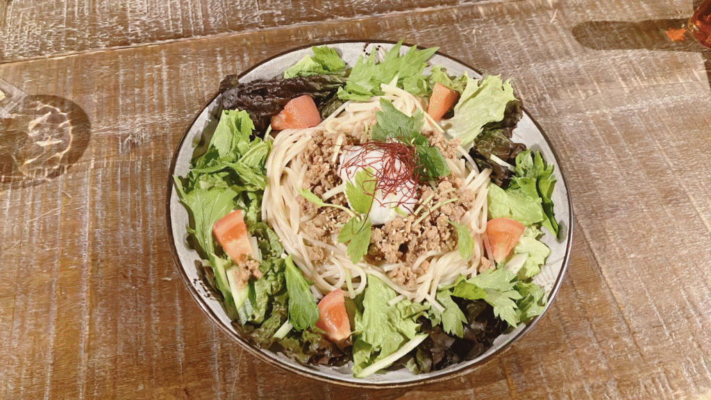 たっぷりの野菜と甘辛い肉みそが、もちもちのパスタとよく合っておいしいです。