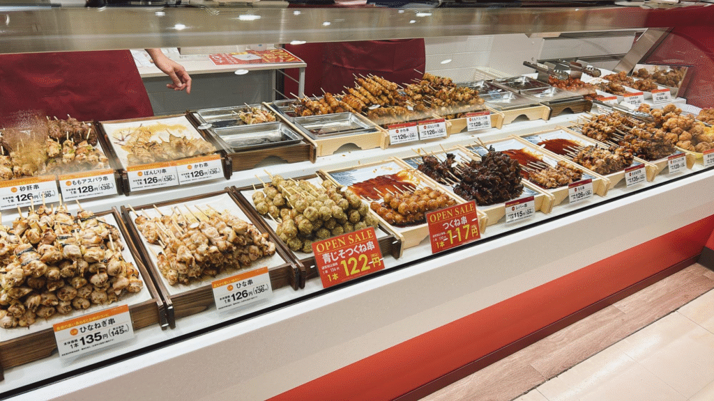 店頭にはさまざまな種類の焼き鳥が並びます。