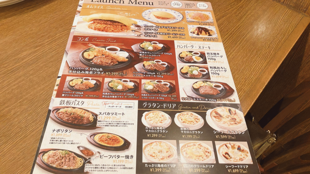ハンバーグ、オムライス、グラタンなどの王道洋食メニューはどれもおいしそうです。