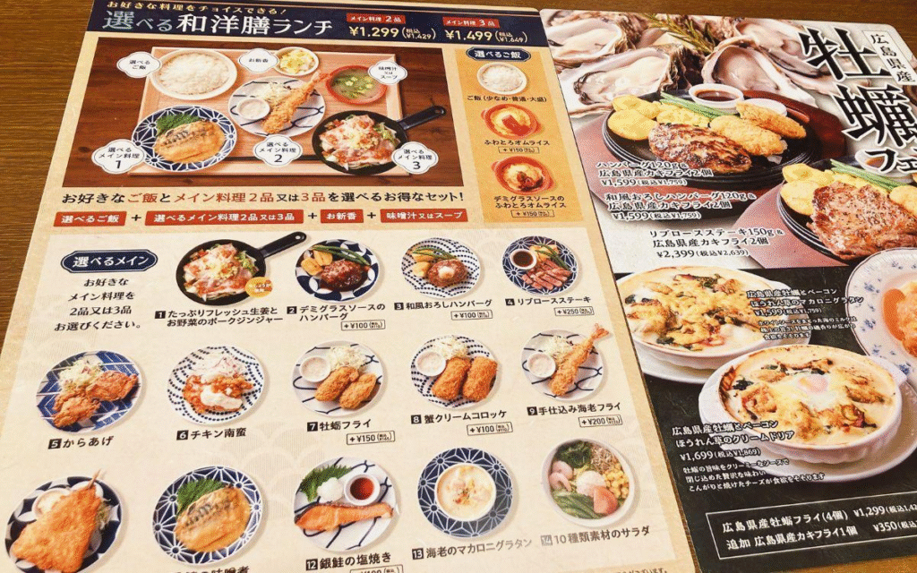 あっさり系、がっつり系が和食洋食共に揃っており、おなか具合に合わせて自分好みに選べるのがうれしいですね。