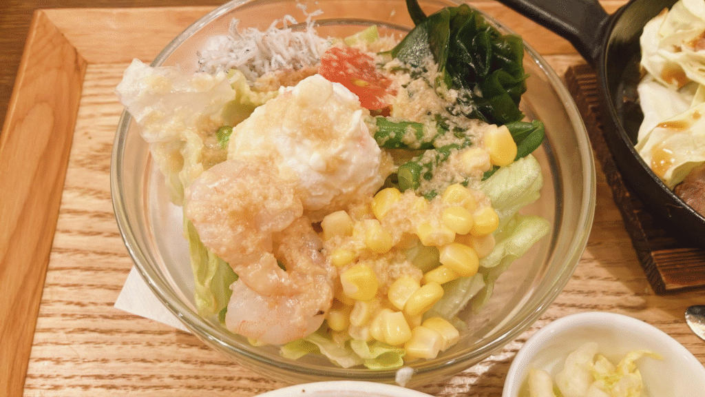 サラダも想像以上に豪華で、エビやシラスなど具材がたっぷり!