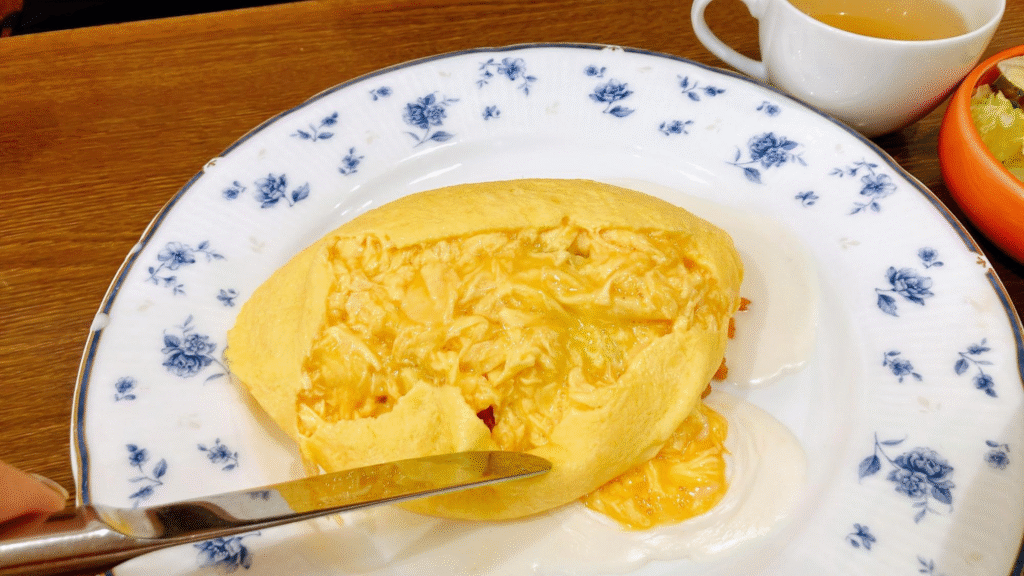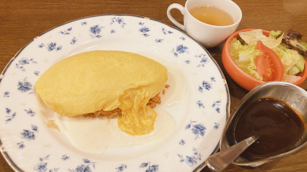 ランチタイムのオムライスはサラダ、スープ付きです。
