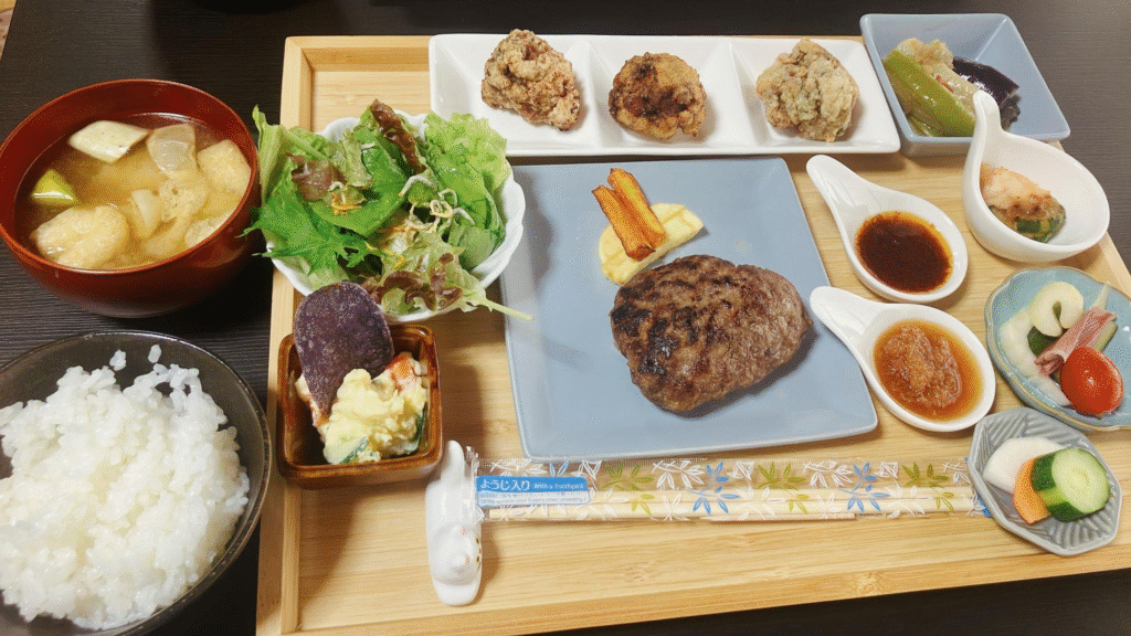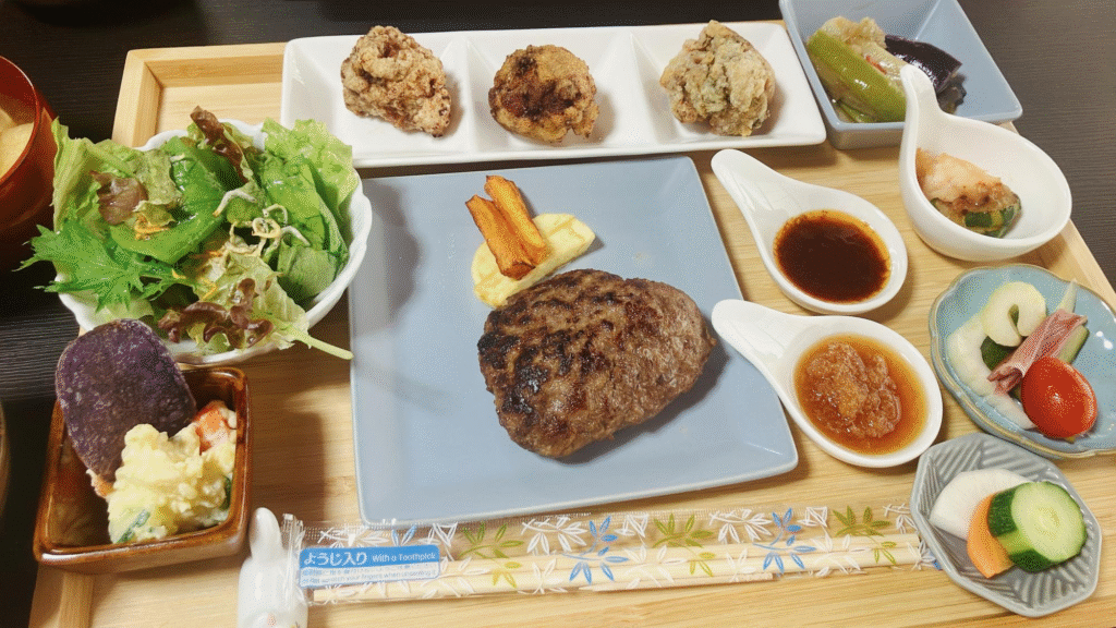 メインのハンバーグはふっくら―ジューシーで、2種類のタレで楽しむことができました。