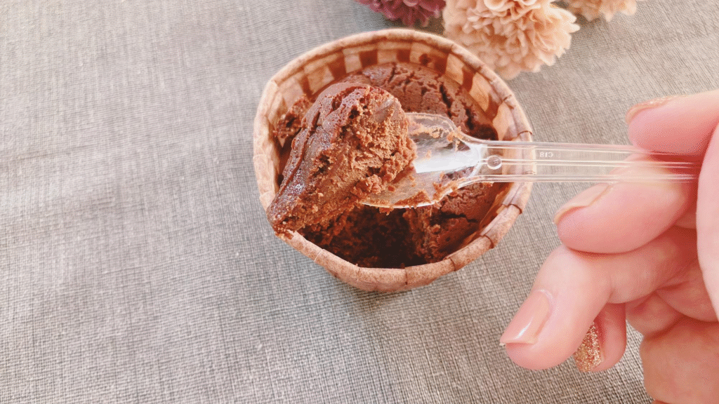プラスチックスプーンでは折れそうなくらいギッシリ詰まっていて、ガトーショコラというよりもはや生チョコの濃厚さ!