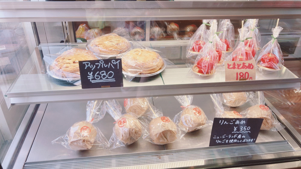 BELIERのりんごあめ、とまとあめやアップルパイはオオスミフルーツのショーケースに並んでいます。