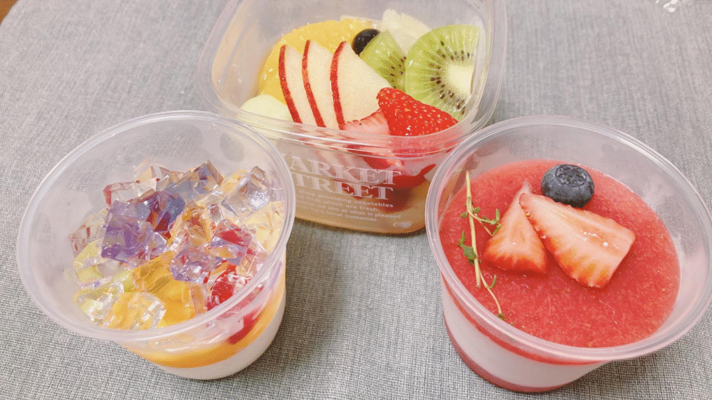 左からパンナコッタ、みつまめ、ストロベリームースです。