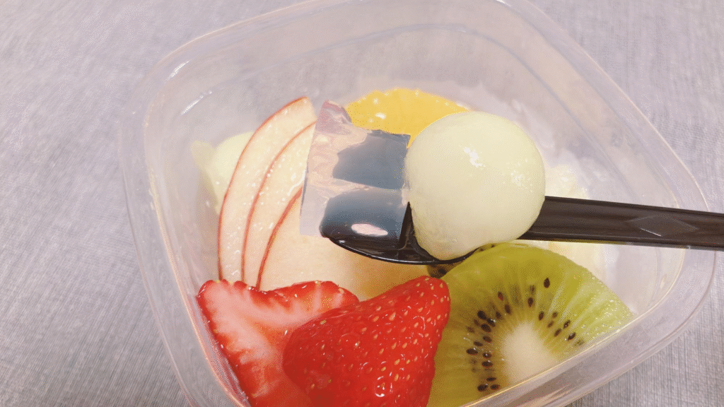 みつ豆にはフルーツが豪勢に使われていて、寒天よりも果物の方が多いかもしれません。