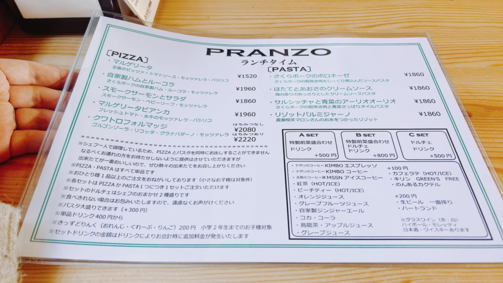 ピザまたはパスタに、前菜やドルチェなどを好みでセットにすることができます。