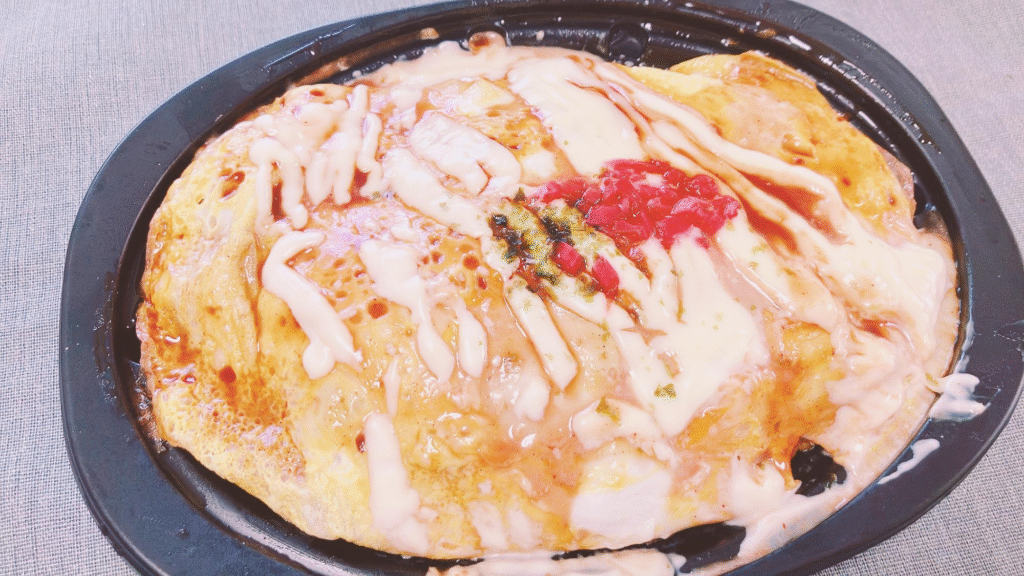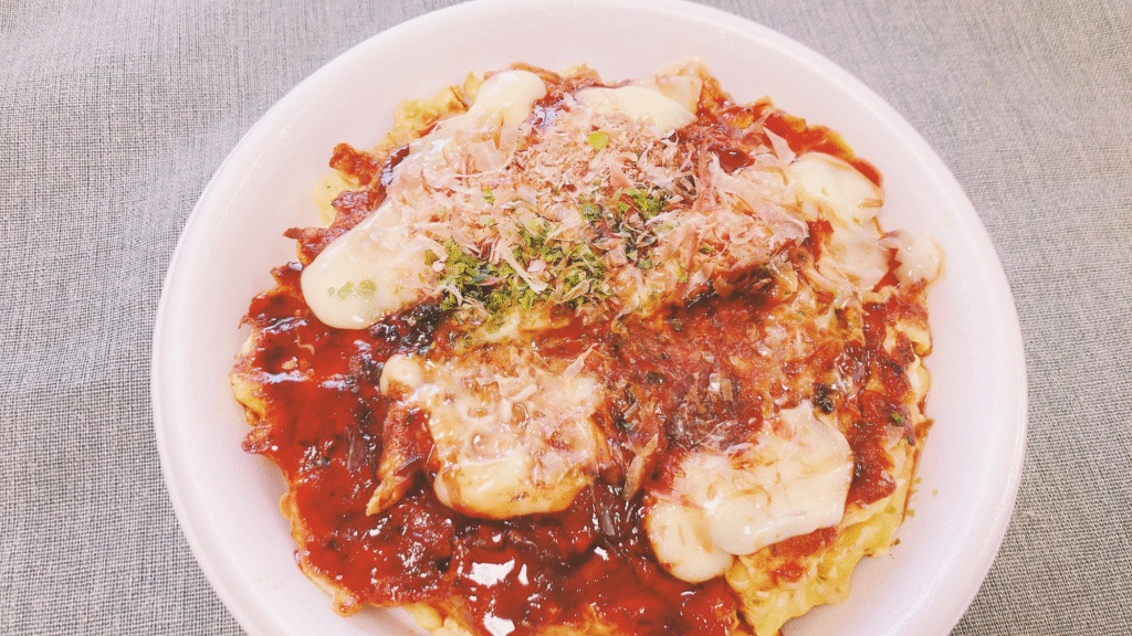 コーン入りのお好み焼きは珍しいですが、甘くて子ども受けがよかったです。