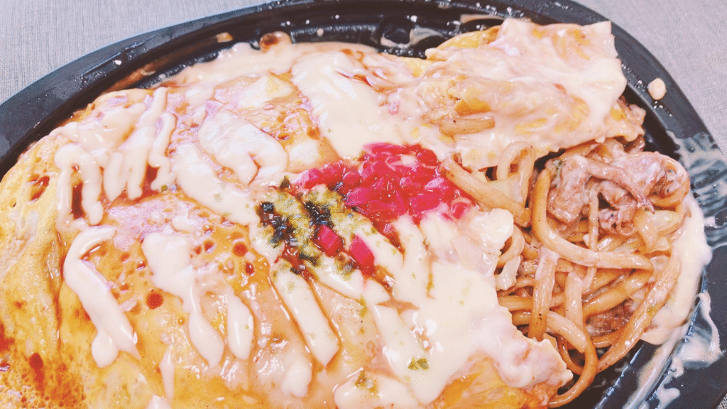 薄焼き卵の下にはモチモチの焼きそばが入っていてボリューム満点!