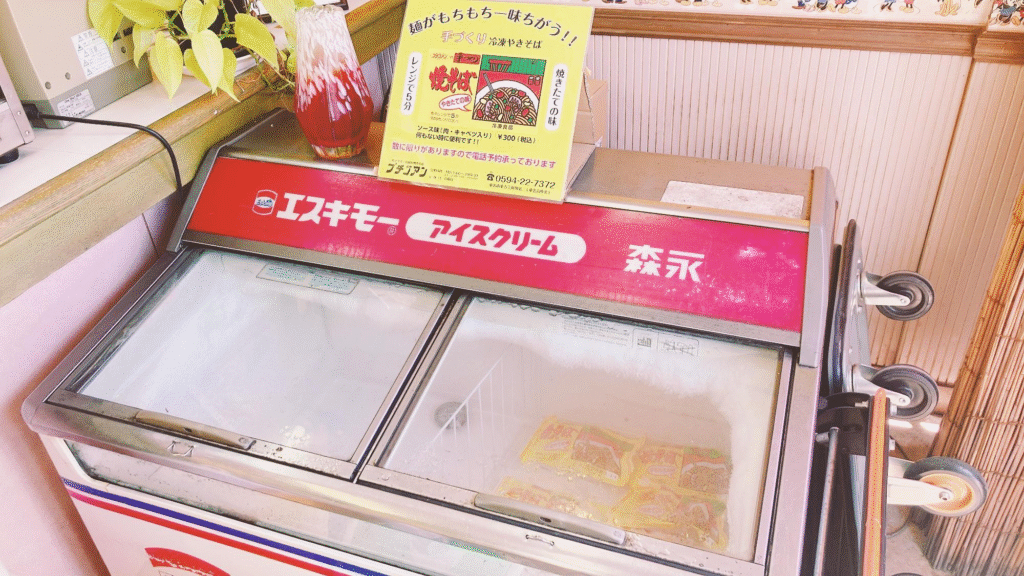店内に設置された冷凍庫にはアイスが入っているのかと思いきや、中身はプチコアン手づくりの冷凍焼きそばでした。