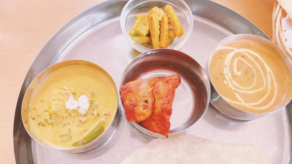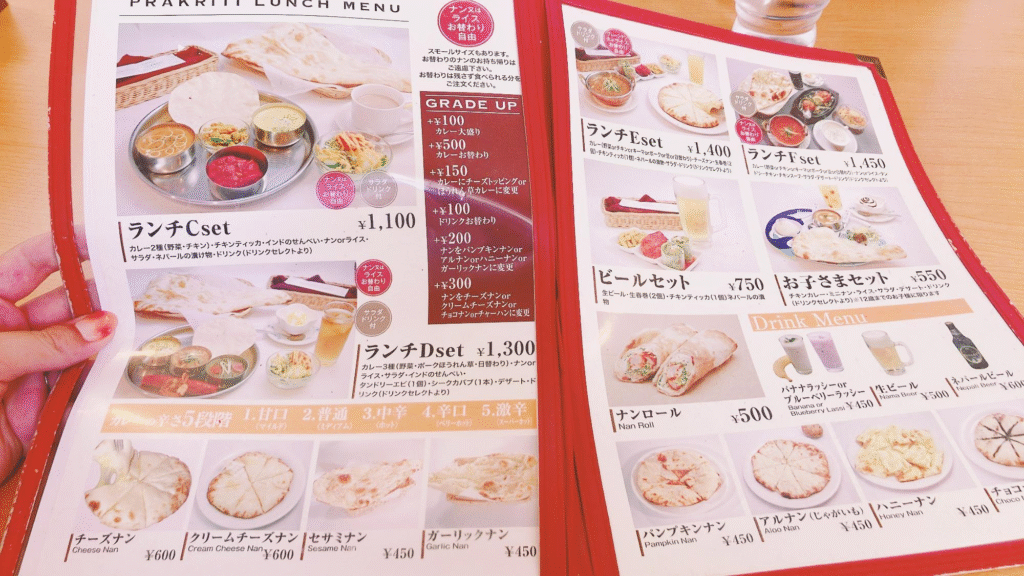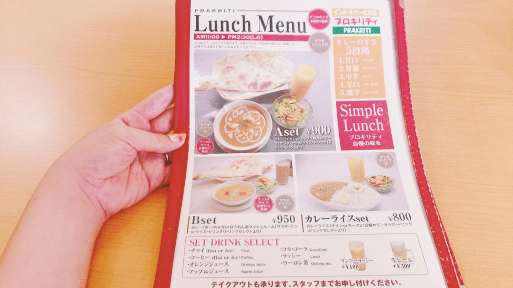 カレーが2つ、3つセットになったものやおかず付きのもの、子供向けのメニューも用意されています。