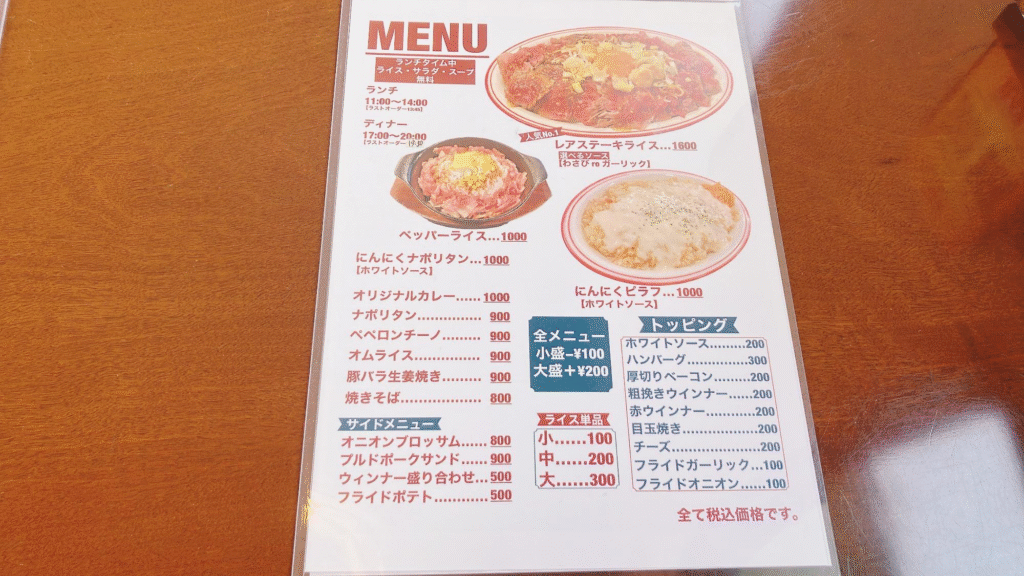 お肉系のメニューがイチ押しですが、オムライスやナポリタンなどの喫茶店感があるメニューもそろっていますね。