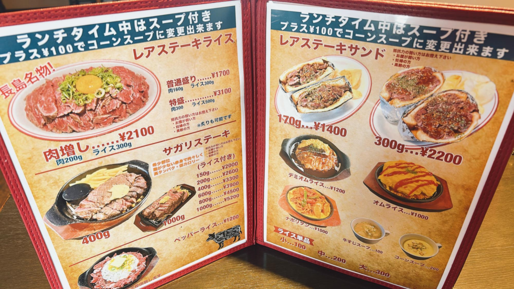 名物のレアステーキライスほか、ステーキメニューが豊富です。