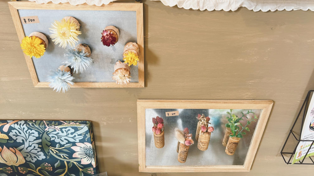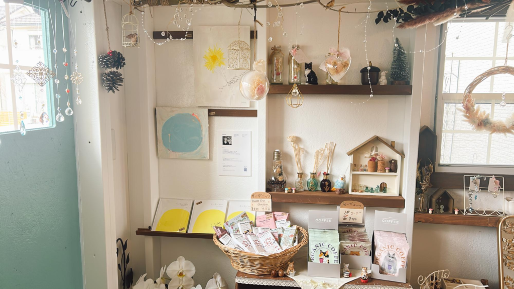 キラキラと輝くサンキャッチャーや、お花を使った小物は店主が手作りしている商品です。