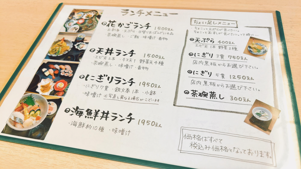 一番人気の花かごランチのほか、天丼やお寿司、海鮮丼などが選べますよ。