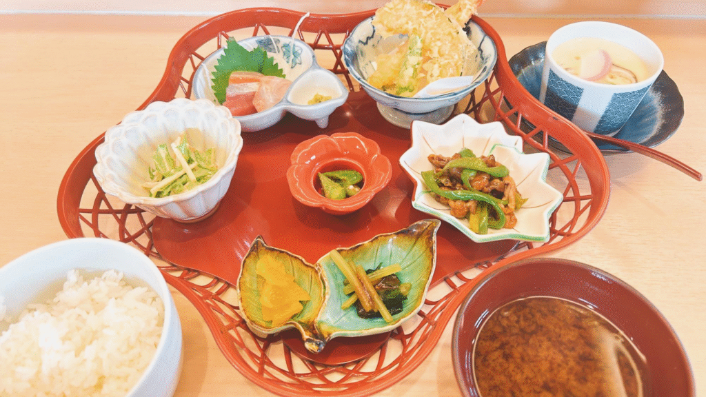 刺身と天ぷら、日替わりのおばんざい4種や茶碗蒸しなどがついており、あれこれ少しずつ食べたい方にピッタリです。