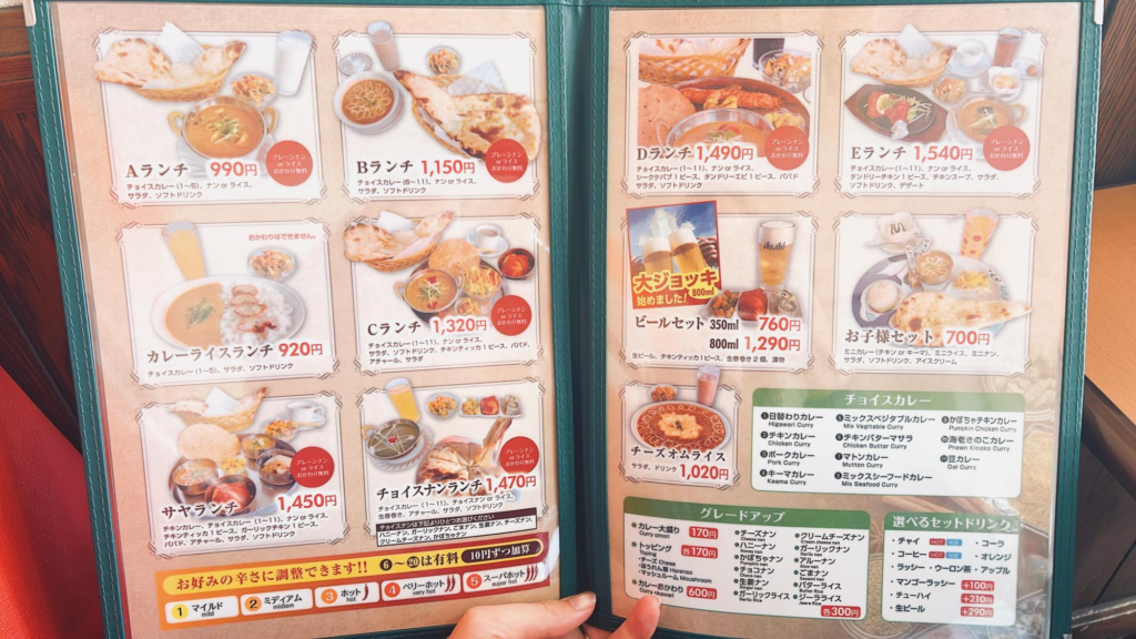カレーの種類やナンの種類、辛さなどから好みのものをチョイスできますよ。